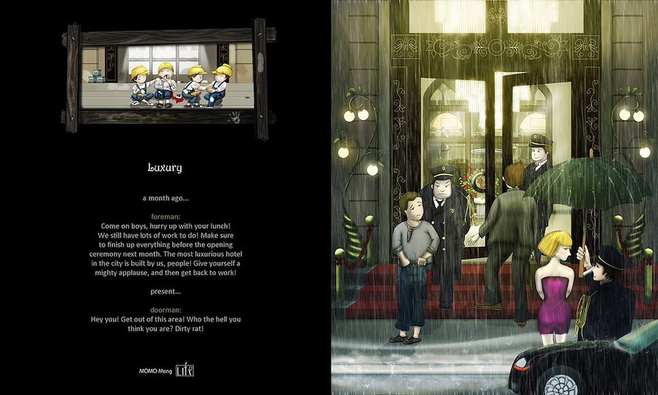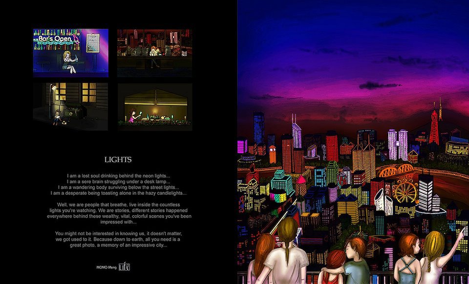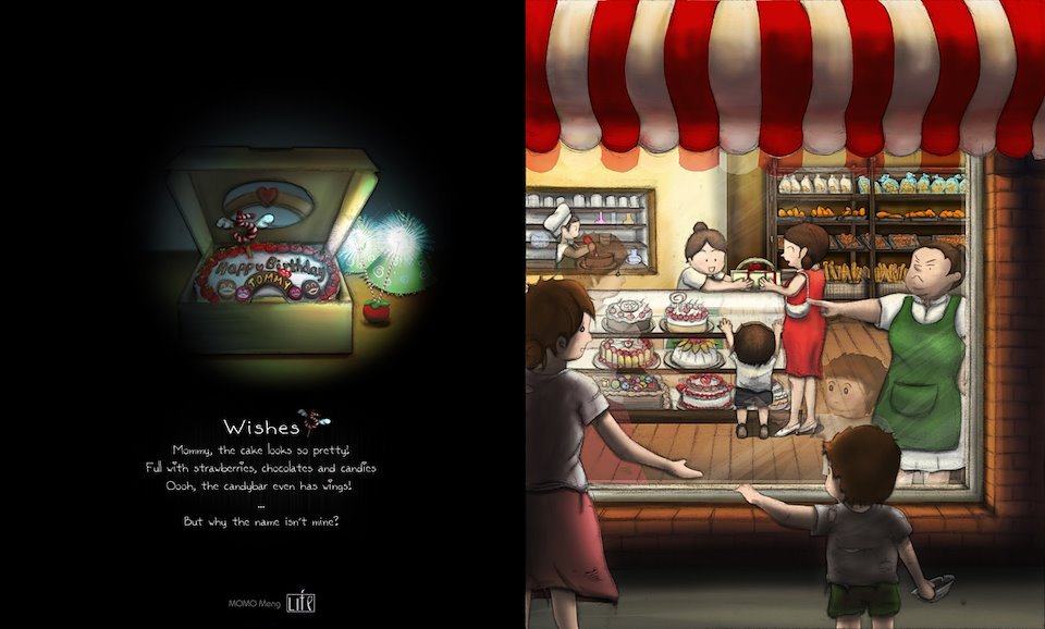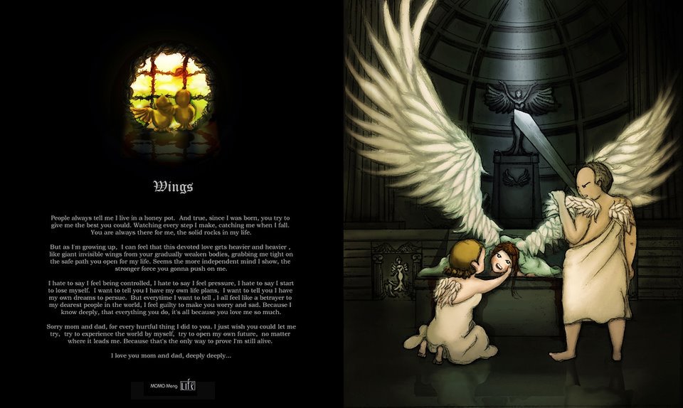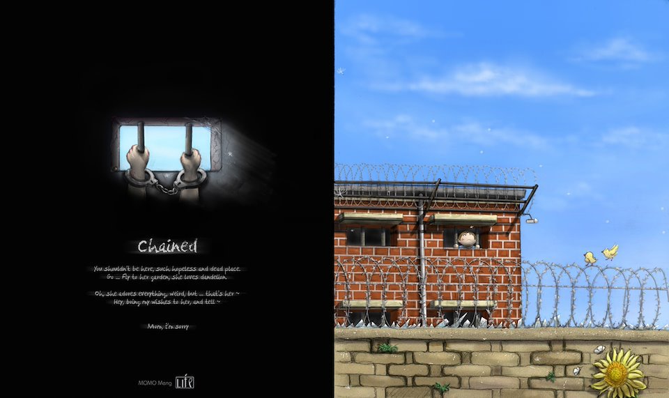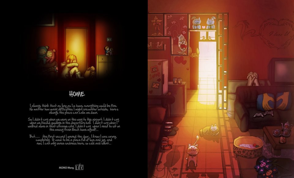 Most of the finished stories of “boxes of life” are quite depressed, but actually you won’t feel their darkness just by a quick glance. Because most of the right parts are bright, vivid and warm, but together with the dark scenes and depressed text on the left, such strong contrast could express out a kind of intense darkness feeling. Of course, as I said before, “boxes of life” probably would become a life working project for me, so I probably would add in more positive stories in the future. After all, life must go on, isn’t it? Expressing depression is a way to relieve, but a positive heart is the key to keep living inside “boxes”.