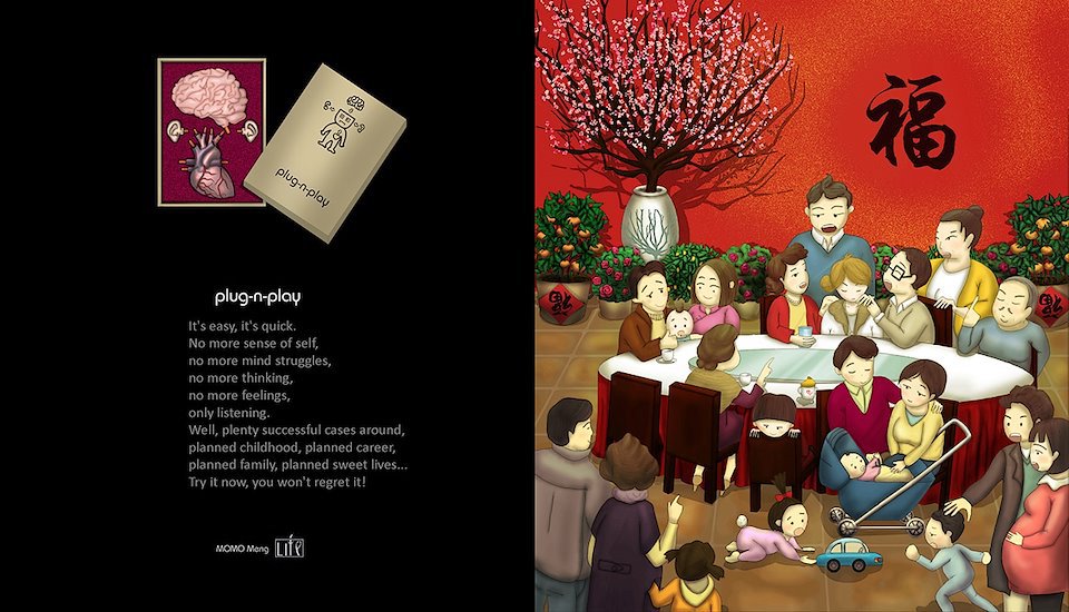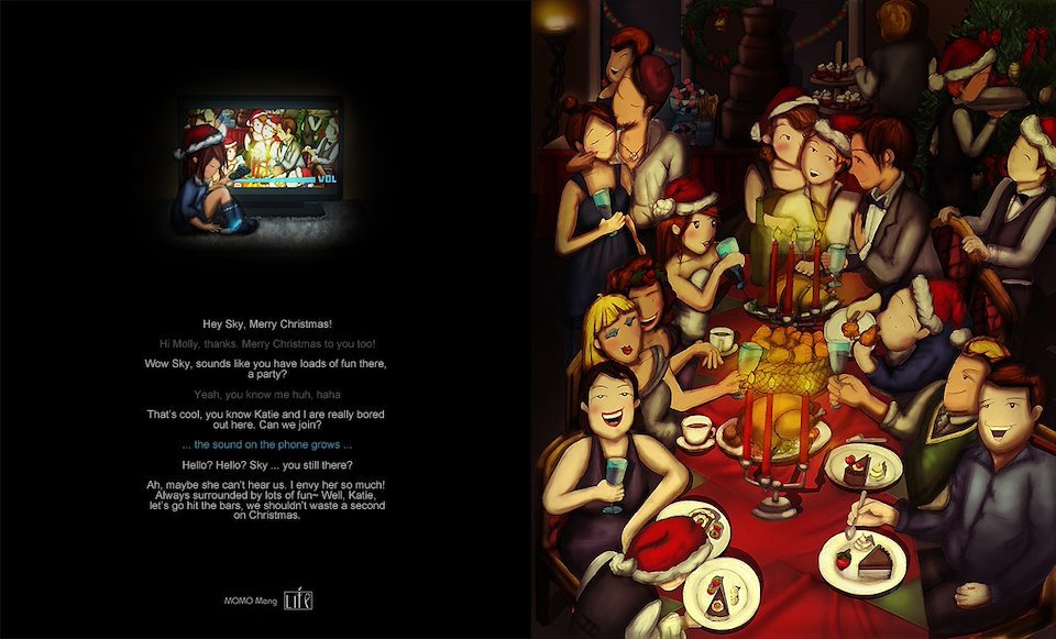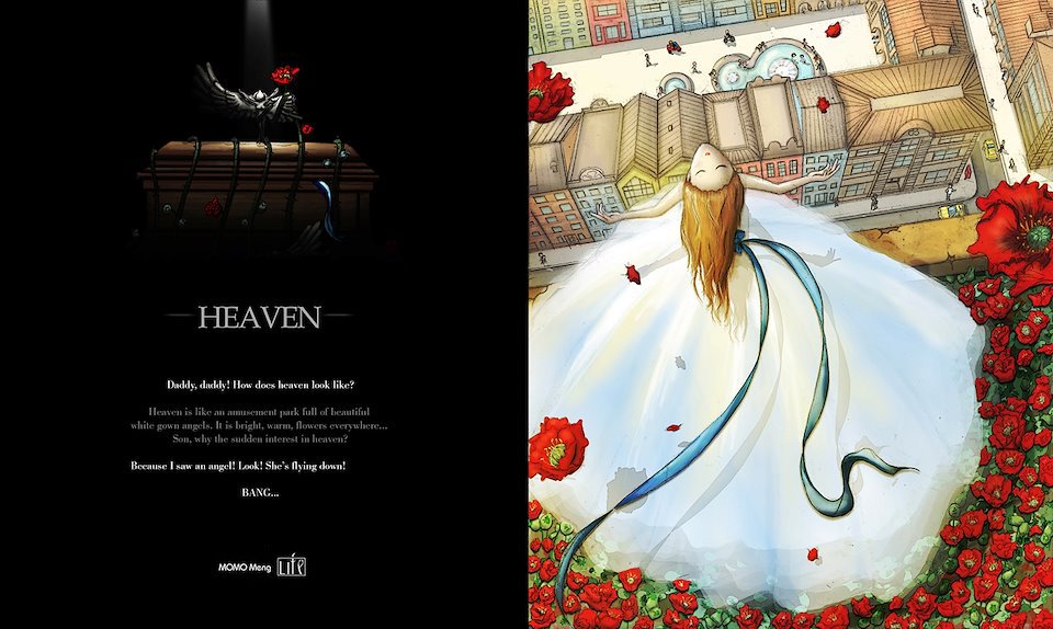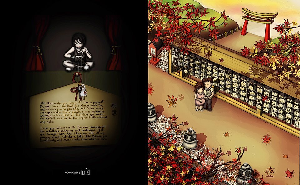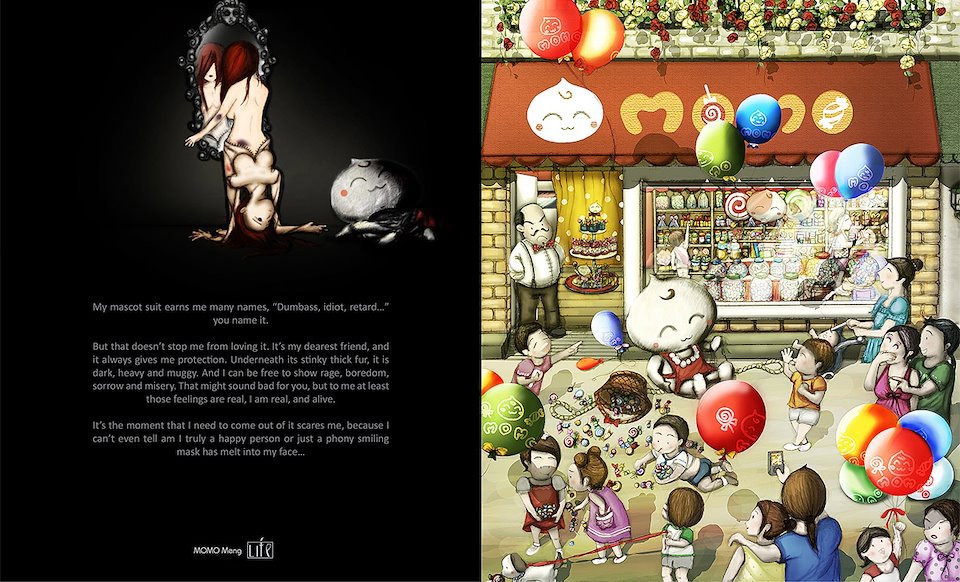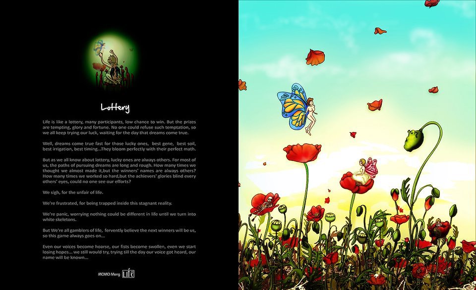 Most of the finished stories of “boxes of life” are quite depressed, but actually you won’t feel their darkness just by a quick glance. Because most of the right parts are bright, vivid and warm, but together with the dark scenes and depressed text on the left, such strong contrast could express out a kind of intense darkness feeling. Of course, as I said before, “boxes of life” probably would become a life working project for me, so I probably would add in more positive stories in the future. After all, life must go on, isn’t it? Expressing depression is a way to relieve, but a positive heart is the key to keep living inside “boxes”.