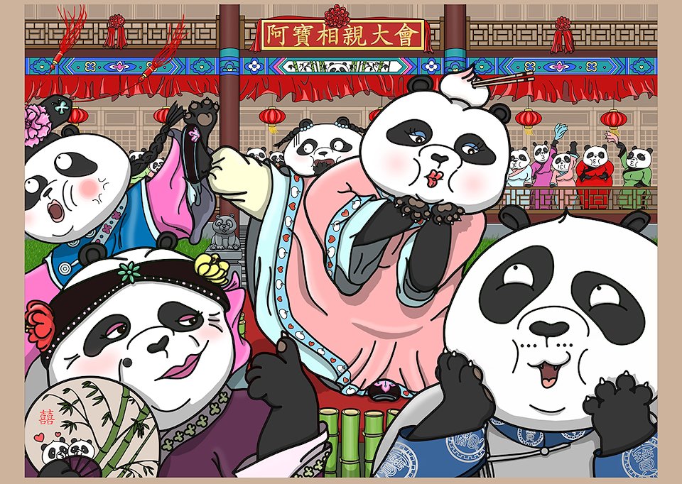 Hosted by MeiPo (a Chinese female matchmaker with a big mole), panda girls coming in all shapes and looks are fighting for Po's attention. A Kungfu girl panda with a lovely meat bun on her head successfully catches Po's eyes, even the MeiPo is giving a go thumb.