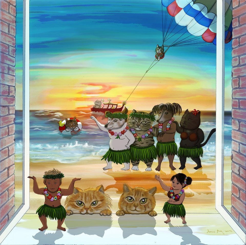 One of my dearest family members lives in Belgium. As the weather there always gloomy, rainy and cold, she never stops dreaming for the heat of sunshine. So I bring in me and my huni, our two lovely kittens (in the front), and all the pets there with her in Belgium into this illustration “Hallo Sunshine”. Wish we could bring her and all of you who are watching, a beam of sunlight, a smile on face and the warmth in heart. Enjoy!