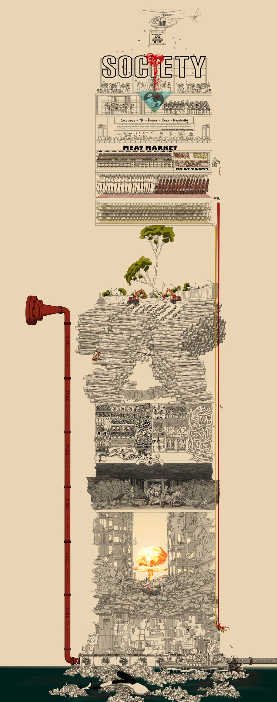 “The Machine” touches many aspects of our society, including social values, environmental crisis, pollution, animal cruelty, slave labour, war, poverty and so on. As you can see, our society is extremely vulnerable. We are depending on that last tree to hold the balance of the whole structure, yet we are chopping it; we need a solid foundation to function properly, yet we are bombing it; we are wiping out other species and killing unnecessary lives, just so we can dump them away as garbage, meanwhile leaving the other side of the world rot to death from hunger and poverty; we need variety to feel alive, yet we allow the society to feed us these shallow formulas of success and happiness.