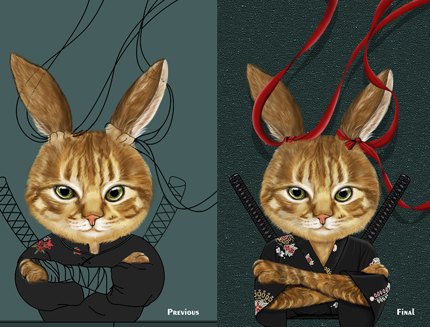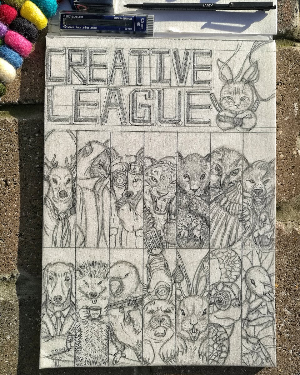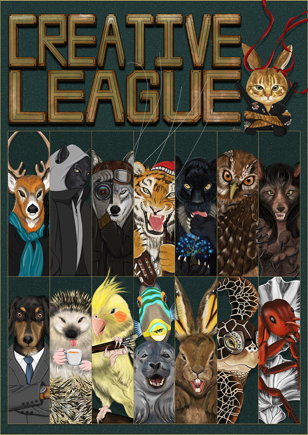 “Creative League” represents a bunch of artists and friends I’ve met through Parallax Art Fair Manchester last year. I asked each of them to tell me 1 or 2 kinds of animals who suit their personalities the most, then I came out with this concept. Some of them are combinations of creatures, including myself, the kitty-bunny assassin on top.