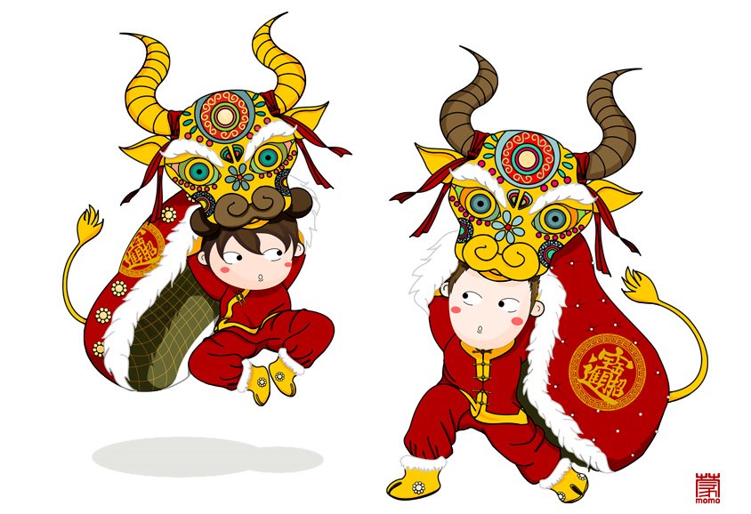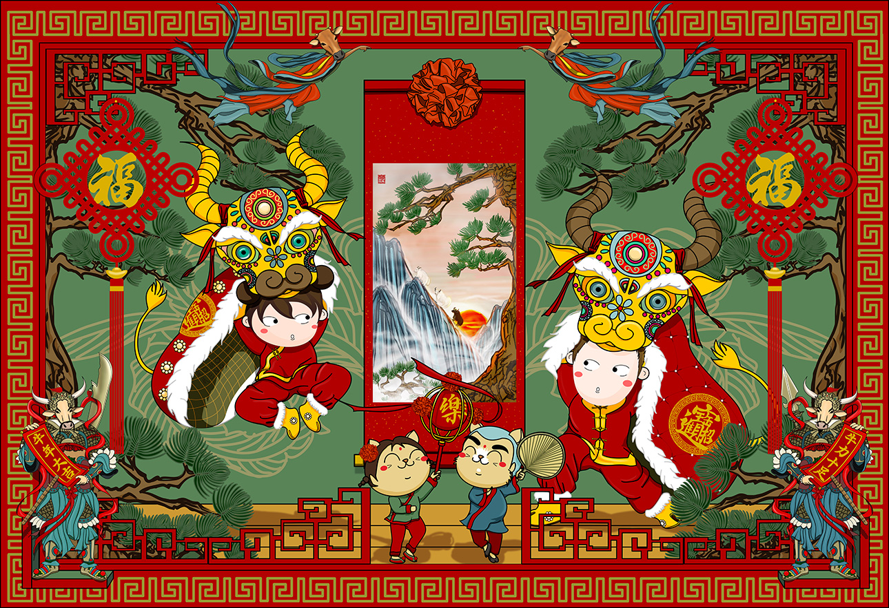 小蒙年画又出炉啦!终于在年廿九完成了这幅牛年年画,开心! 这是一幅画中有画、非常喜庆的作品,而且为了使画中的每一个元素都可以独立成章,做到细节能够无限放大,我在这幅年画的创作上花费了蛮长的时间。举个例子吧,画面正中央的卷轴挂图,它本身就是一幅独立而精细的中国国画作品。
