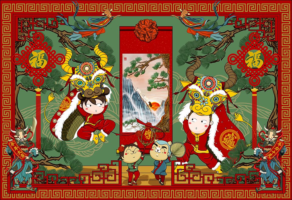 I want to create a very special and festive piece to celebrate the arrival of the Year of the Ox, so I've spent quite a long time on this creation and added in quite an insane amount of details. Every element on this image is able to stand alone as an independent art piece. For example, the scroll in the center itself is a detailed work of Chinese traditional painting. Honestly, I'm quite happy with the outcome.
