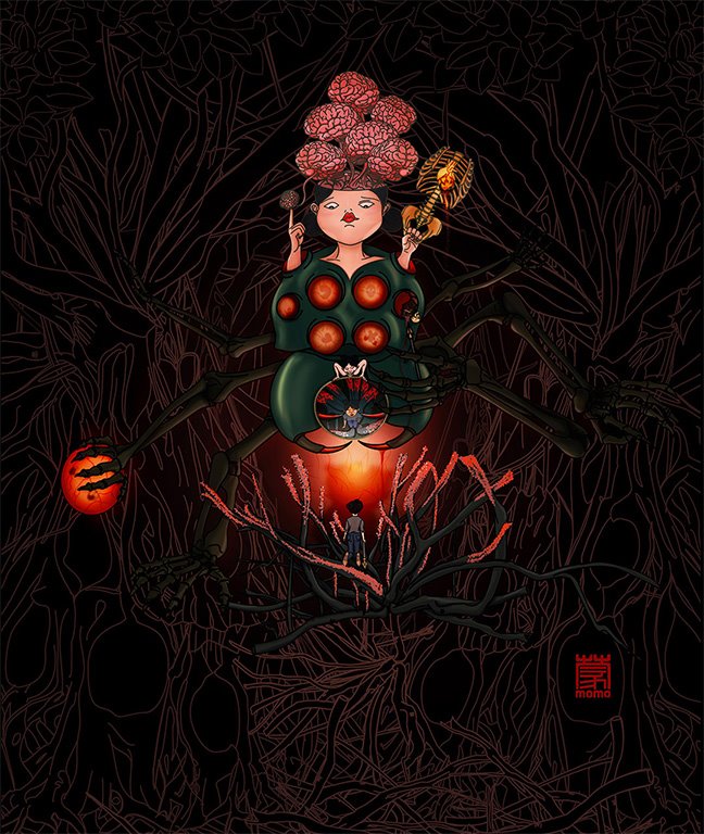 The incomparable existence that stands in mid-air deeply shocks me. She is the owner of the lair, the maker of endless nightmares, a gigantic creature with a spider-like body and a human face, and a monster who is capable of self-reproduction. She is ugly, but also captivating. The mycelium-like luxuriant brain group keeps dancing on the top of her skull, piercing innumerable crazy thoughts into the blood-red thought follicles on her armor like sperms, igniting waves of fanatical heartbeats. Transferred from her exoskeleton to the forest's dense tree holes by the skeleton-like long arms, semi-mature fertilized eggs continue to hatch rapidly. On the day of maturity, these soul-gnawers will break through the shells, and eat away every inch of my peace and reason.