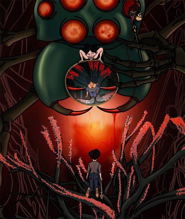 The roar in my ears becomes more and more deafening. I can't tell whether this continuous infernal noise is meant to stop me from moving forward or an arrogant invitation. All I know is that under the gaze of many terrifying eyes, I have reached the origin of the forest, a place where all my pain has been born. So I clench the spear in my hand, embolden myself, and climb into the huge red glowing lair.