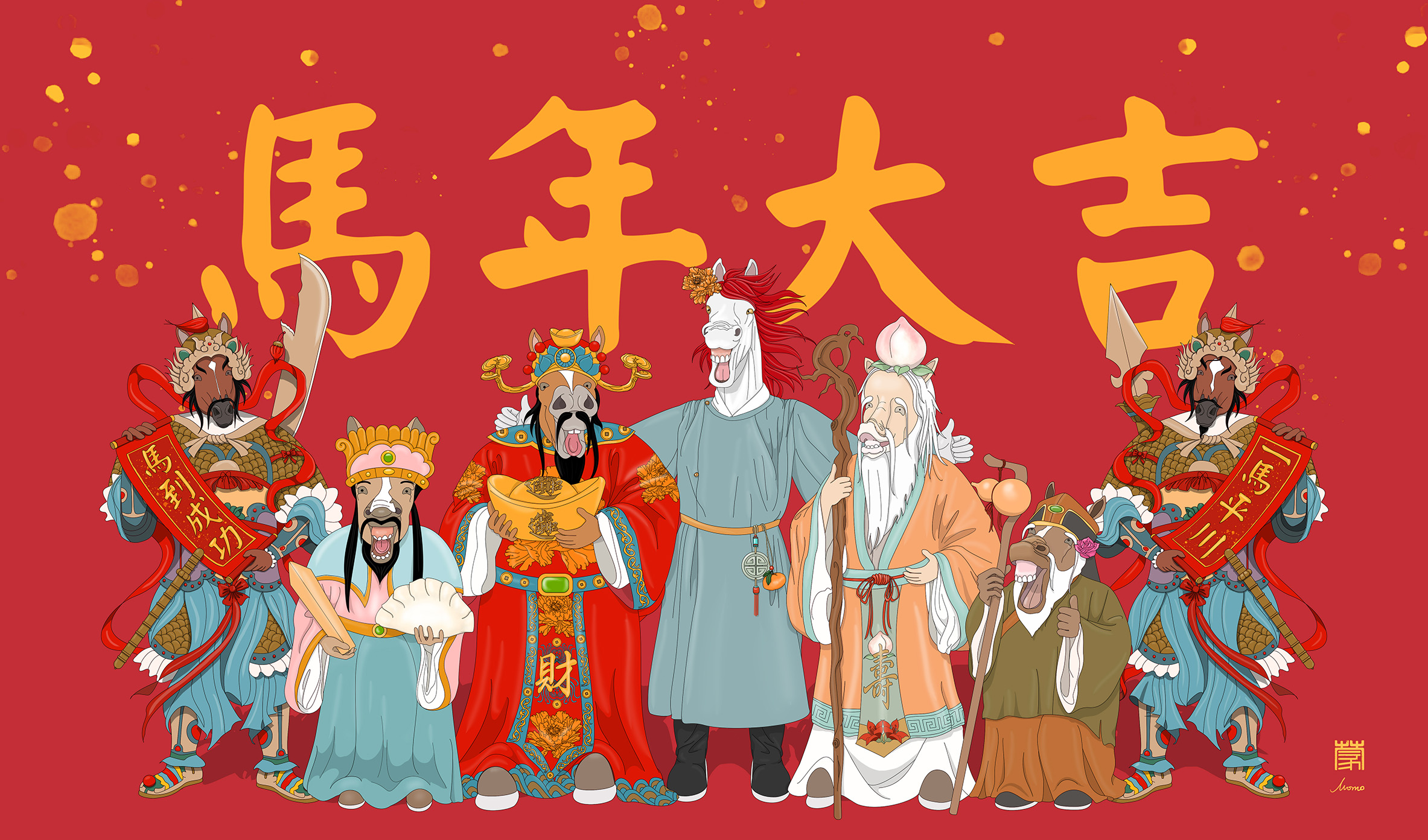马年正朝我们欢快地奔来,我以我国重要古籍《山海经》中一种象征长生的神马——吉量为主角和灵感,连同一众象征吉祥福气的中国传统神明,创造了这幅马年新春年画,以此祝愿大家马年大吉,身体健康,心想事成。新春愉快!